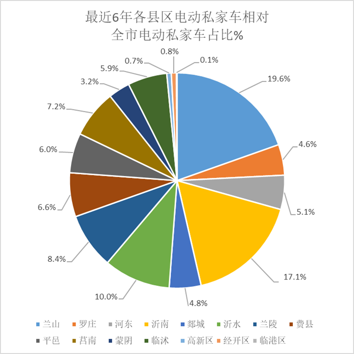 2020年临沂市纯电动公交车约2000辆,出租车约3500辆,私家车133.8万辆,其中电动私家车约2.3万辆。根据对全市电动私家车中各县区的占比计算结果,见图1,兰山区是19.6%,沂南县是17.1%,分别排在第一位和第二位,相比其它县区占比高。