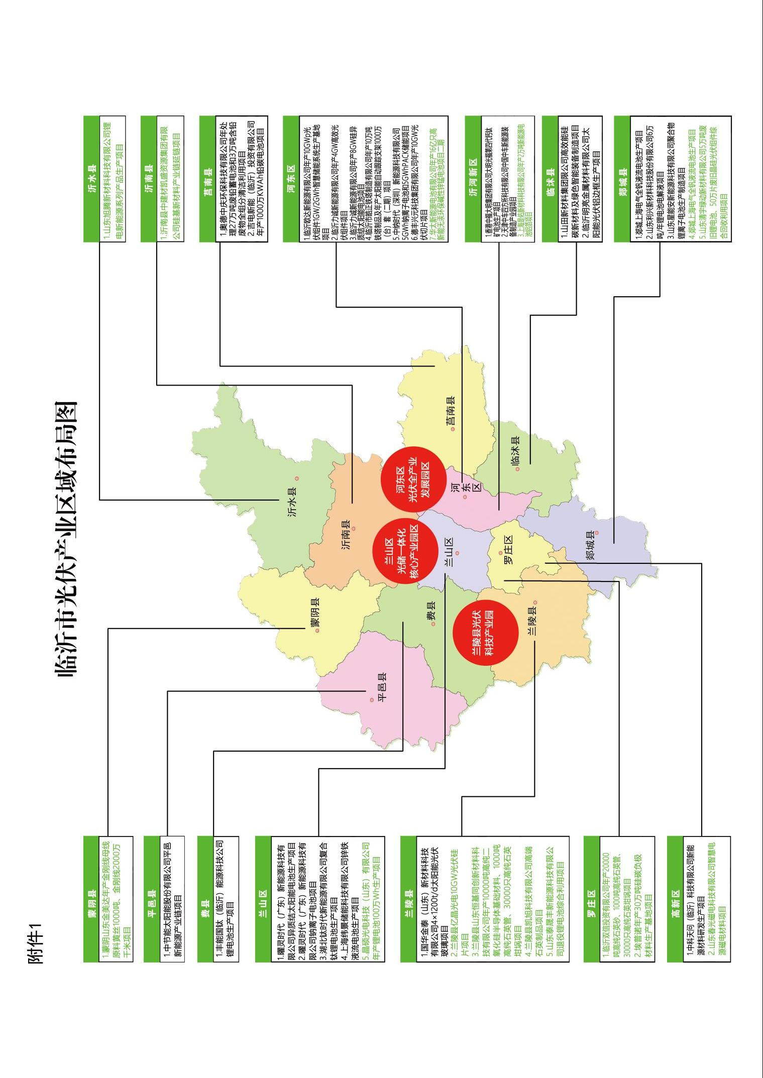 1.重点引进企业 隆基、TCL中环、晶科、晶澳、上机数控、京运通、环太、高景、阿特斯、协鑫 2.重点项目 (1)兰山区曜灵时代(广东)新能源科技有限公司2GW硅片。 (2)河东区德峰兴元科技集团有限公司年产10GW光伏切片项目。 (3)兰陵县亿晶光电10GW光伏硅片项目。 (4)沂南县中建材凯盛资源集团有限公司硅基新材料产业链延链项目。 |