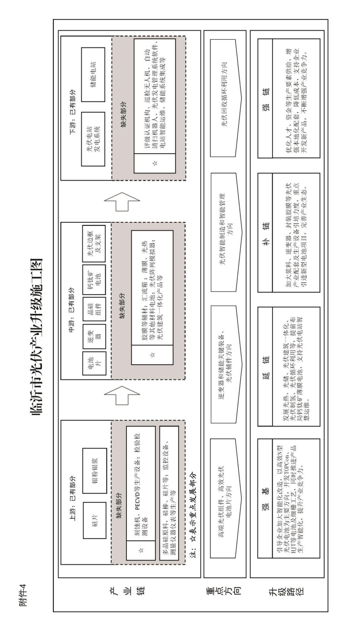 1、健全协调机制,优化发展环境。临沂市在全省率先出台了《临沂市分布式光伏建设规范》,重点对50千瓦以下户用和6兆瓦以下工商业屋顶分布式光伏电站的设计、安装、验收和运维进行具体规范,为分布式光伏规范、有序、高质量发展提供政策支撑。及时印发《关于做好分布式光伏并网运行工作的通知》,要求供电公司主动公开区域、变电站光伏和台区分布式光伏最大开放容量,定期滚动更新,协助试点县、开发企业做好整县开发电网接入工作。加强储能配套建设,120万千瓦沂蒙抽水蓄能电站于2022年3月正式投运,建成中核郯城、沂水国电投2座10万千瓦独立储能电站,国华兰陵压缩空气储能等5个独立储能电站进入省示范项目名单,正在加快推进。强化质量管控,例如,在推进整县分布式光伏开发过程中,指导试点县结合实际,制定《整村推进开发方案》、《整县光伏项目安全质量考核办法》、《光伏电站运行维修管理规程》等一系列项目开发及安全管控制度文件。 2、优化电网服务,保障并网运行。做精做细光伏配套电网规划,将规划颗粒度细化至供电网格和低压台区,提高电网对光伏发电大规模接入的适应性。实施光伏可开放容量发布机制,引导光伏在电网接入和消纳能力强的区域发展。开辟光伏配套电网工程建设“绿色通道”,保障配套电网工程与光伏本体工程同步投产。贯彻落实服务可再生能源接网“两个细则”,深化应用“新能源云”“网上国网”两个网上办理平台,简化分布式光伏备案、接网流程,最大程度为用户提供便利。拓宽新能源消纳渠道,加装9852个分布式光伏并网保护开关,实现对分布式光伏的精准调控、高效运行。2022年以来,临沂市新建220千伏变电站2座,新增主变容量66万千伏安;新建110千伏变电站9座,新增主变容量110.8万千伏安;扩建110千伏主变22台,新增主变容量110万千伏安;新建改造公用配变547台、净增配变容量22.1万千伏安;新建改造10千伏线路760.2千米。电网新能源承载和消纳能力大幅提升,全力满足光伏开发并网需求。 3、开展试点示范,打造沂蒙样板。大力推进整县分布式光伏试点建设。沂水县、郯城县、河东县、高新区、兰陵县、平邑县等6个县区成功纳入国家级整县屋顶分布式光伏开发示范试点,指导县区编制了《整县推进工作规划》,积极与国内各大能源集团对接洽谈、开展合作。截至2023年10月,6个试点县累计装机并网197万千瓦,打造寺前官庄村10千瓦集中升压汇流项目等一批具有沂蒙特色的分布式光伏示范工程。加快光伏发电重点乡镇和园区创建。在全市开展光伏发电重点乡镇和园区推广应用,10个重点乡镇和园区光伏装机达到2万千瓦以上,形成了良好的示范效果。开展绿色能源发展标杆乡村示范建设。开展绿色能源发展标杆乡村示范建设,将分布式光伏与农林生物质综合利用、农村沼气设施建设相结合,着力推广乡村绿色发展新模式,4个乡镇、21个村获评山东省首批绿色能源发展标杆乡镇和标杆村。农村户用领域,沂水县形成了一整套标准化、流程化、可复制、可推广的制度流程和开发经验,建设了“首个”群众受益的项目,首创“彩钢瓦+光伏”,实现了“光伏+美丽乡村”的完美结合,打造了尧崖头村等一批具有沂蒙特色的分布式光伏应用样板。工商业厂房领域,沂水青援食品、郯城大将军建陶等工商业厂房光伏项目涵盖BIPV、混凝土屋顶、钢结构彩钢瓦屋顶等多种类型,促进光伏建筑一体化融合发展。兰陵装备智造小镇50兆瓦分布式光伏发电项目,积极推动新能源产业与智能制造相结合。党政机关领域,郯城县泉源镇全镇95%的党政机关建筑、公共建筑已覆盖分布式光伏,成为名副其实的“光伏示范小镇”。公共建筑领域,沂水县武家洼中学分布式光伏项目是省内首个整县分布式光伏并网发电项目,也创造了整县开发并网最快记录。 (二)光伏制造成链成势。临沂市抢抓光伏产业升级换代窗口期,以引进新型高效光伏技术为方向,提前布局先进产能,围绕产业链开展精准招商,多个光伏制造企业落户临沂,形成涵盖“光伏硅片—光伏电池—光伏组件—光伏玻璃—光伏辅材—储能系统—光伏发电工程”的完整产业链架构,临沂市光伏产业实现从零到一、从无到有的深刻蜕变,目前,在“硅料、硅片、太阳能电池、光伏组件、电站建设”5个关键环节中,临沂具备4个(硅料暂时没有);在“光伏玻璃、支架、逆变器、胶膜、银粉银浆、储能系统”6个关键配套中,临沂具备5个(胶膜暂时没有)。2022年以来,先后引进了22个光伏、储能项目,总投资超600亿元,光伏产业实现一年成链成形成势。 1、核心装备方面,已形成了硅片、光伏电池、光伏组件一条龙的光伏制造体系。兰山区投资60亿元的曜灵时代2吉瓦硅片、2吉瓦高效硅异质结电池、4吉瓦高效硅异质结光伏项目已经投产,全部达产后年产值可达220亿元。河东区欧达新能源主要生产10吉瓦光伏项目,总投资25亿元,项目一期、二期已投产,年可实现产值60亿元。河东区力诚新能源一期年产5吉瓦光伏项目总投资13.5亿元,年产值30亿元,目前已投产;二期8GW高效太阳能电池项目已启动。河东区德峰兴元科技年产10吉瓦光伏切片项目,总投资15亿元,可实现产值30亿元,项目已签约。高新区中科天问年产1.2吉瓦光伏项目,总投资6亿元,可实现产值8亿元,项目已投产。沂河新区大明光福1吉瓦钙钛矿光伏