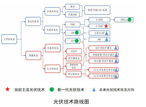 (二)太阳能电池产业 1、市场前景 单、多晶硅片经过制绒、扩散、刻蚀、镀膜、烧结、测试等工艺制程得到电池片。单体太阳能电池片不能独立使用,需与若干电池进行串、并联,并严密封装成组件才可进行使用。光伏产业链快速发展的本质是技术驱动“降本提效”,高转换效率、低生产成本是电池片技术的主要发展方向。晶硅电池片根据电池结构分为Al-BSF、PERC、TOPCon、异质结、IBC等,目前市场上以PERC电池片为主,市场占比超过90%。2022年PERC电池片平均量产效率为23.2%-23.5%,基于P型硅片的PERC电池即将达到极限转化效率。TOPCon电池片、异质结电池片平均量产效率均超过24%。由于PERC电池片转换效率提升空间有限,TOPCon、异质结电池成为量产化前景较好的光伏电池技术,随着生产成本降低和效率的提升,TOPCon电池片、异质结电池片市场份额将逐步提升,截止2022年底,TOPCon市占率已达到8.3%,而2021年仅2%,2023年有望快速发展。根据《中国光伏产业发展路线图(2021版)》预测,到2025年,TOPCon和异质结市场份额将超过35%。 薄膜太阳电池是指在玻璃或柔性基底上沉积若干层,构成PN结的半导体薄膜光伏器件,包括铜铟镓硒(CIGS)、碲化镉(Cdte)等。由于近年来,晶硅电池组件产业的快速发展,薄膜电池组件产业被推向边缘化,但随着BIPV产业的兴起,薄膜组件迎来新一轮发展机遇。2022年4月1日起,《建筑节能与可再生能源利用通用规范》开始实施,要求“新建建筑应安装太阳能系统”。同时钙钛矿电池近几年发展迅速,其光电转换效率已经从3.8%提高到25.7%,钙钛矿与硅叠层电池研发效率已达到29.8%,若稳定性问题得到解决,将产生巨大的市场空间。 2、发展目标。重视BIPV等产业机遇,以高转化率、高稳定性、柔性化为方向积极发展新型太阳能电池及组件。以兰山区、河东区、沂河新区等产业优势区域为重点,推动钙钛矿、薄膜等新型电池技术研发应用。结合BIPV发展趋势以及柔性化应用的需求,前瞻布局,引领新型电池产业创新升级,着力培育新型电池研发生产重点企业,打造国内外光伏研发创新高地。组织实施临沂市光伏产业未来产业孵化与加速计划,建设未来产业技术研究院和示范区,推进钙钛矿科技成果在临沂转化应用。加大新型薄膜电池、叠层电池、聚光电池等技术的跟踪、研发和引进力度,寻求国内外在新型电池技术产业化方面取得突破的企业落户临沂。建立电池技术研发测试平台,加强与国家级光伏技术研发、检测机构合作,创立本地电池技术测试服务公共平台、光伏电池技术创新中心、光伏电池技术实验室等科研平台。到2030年,全市太阳能电池片产能达到3000万千瓦以上,打造山东省太阳能电池产业基地。 3、主攻方向 加快推进曜灵、力诚、大明光福等太阳能电池项目建设,快速形成产能。借助光伏电池技术路线发展多样、电池片产业重构的有利时机,高起点、高标准引进新型高效电池片技术和制造企业,按照“产业聚集、优化布局”原则,在引进电池片制造业的同时,加大对配套辅材辅料产业的引进和建设,完善产业链。以曜灵“双碳”(光伏)研究院为重点,支持落地光伏企业设立研发机构,加大新型BIPV、钙钛矿叠层等新型太阳能技术研发。