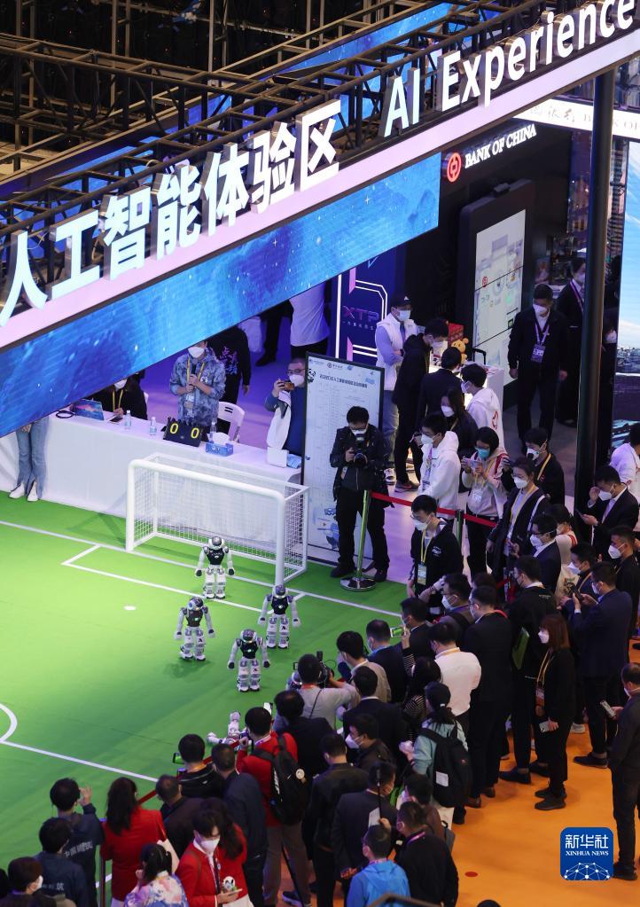 2022年11月5日,参观者在第五届中国国际进口博览会人工智能专区观看机器人表演。新华社记者 金立旺 摄