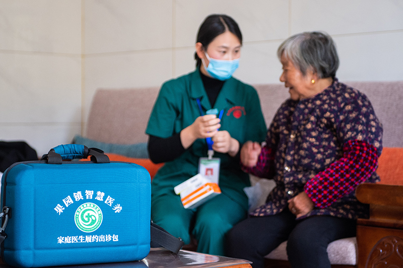 在湖南省长沙市长沙县果园镇杨泗庙社区,医务人员指导居家老人用药(2021年11月12日摄)。新华社记者 陈思汗 摄