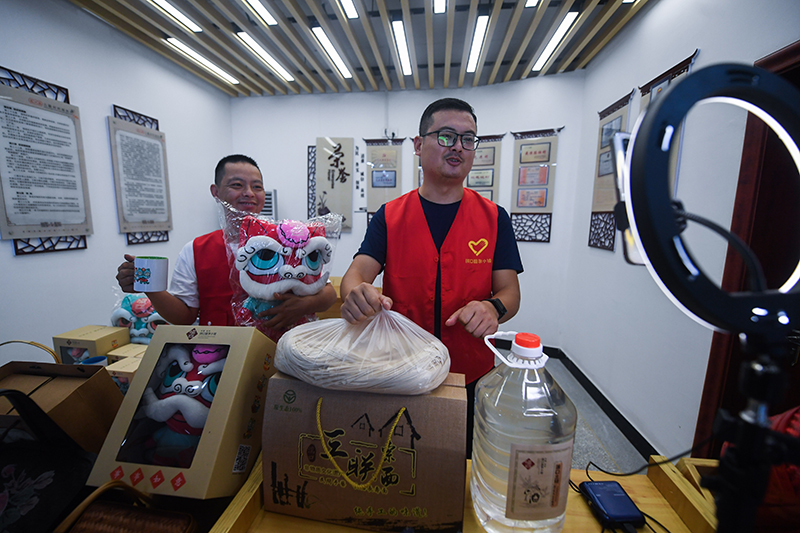 浙江省杭州市临安区湍口镇三联村党总支书记方刚(右)和党员志愿者在村里直播间展示当地特色农产品(2021年8月13日摄)。新华社记者 徐昱 摄