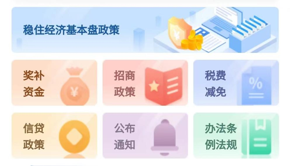 在分类展示区,按照政策类型,将已收录的政策分为稳住经济基本盘政策、奖补资金、招商政策、税费减免、信贷政策、公布通知、办法条例法规等7大类,进行归类汇总。企业只需点击其中的一个分类图片即可跳转到政策列表页面。