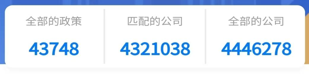 在政策统计区,“全部的政策”“匹配的公司”“全部的公司”三个数据项分别统计了该平台已收录的惠企政策数量、平台中的政策可匹配的省内企业法人单位数量、平台企业库中省内全部的企业法人单位数量。
