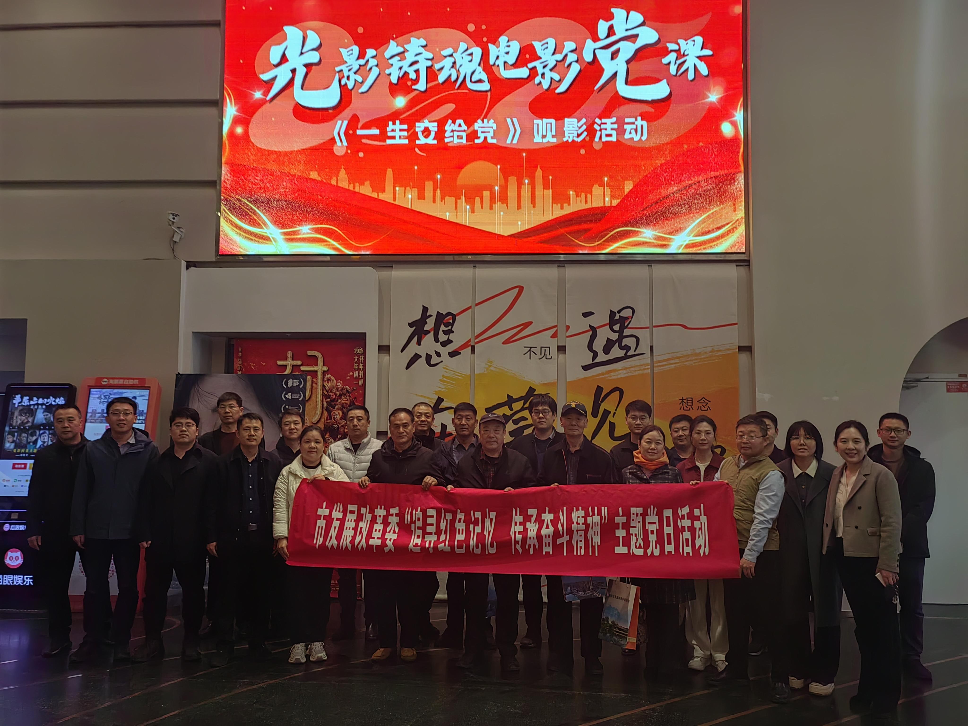 为深入学习贯彻党的二十届三中全会精神,教育引导党员干部加强党性修养、坚定理想信念,3月14日,市发展改革委开展“追寻红色记忆 传承奋斗精神”主题党日活动,组织党员赴蒙奇影城观看国防教育电影《一生交给党》。