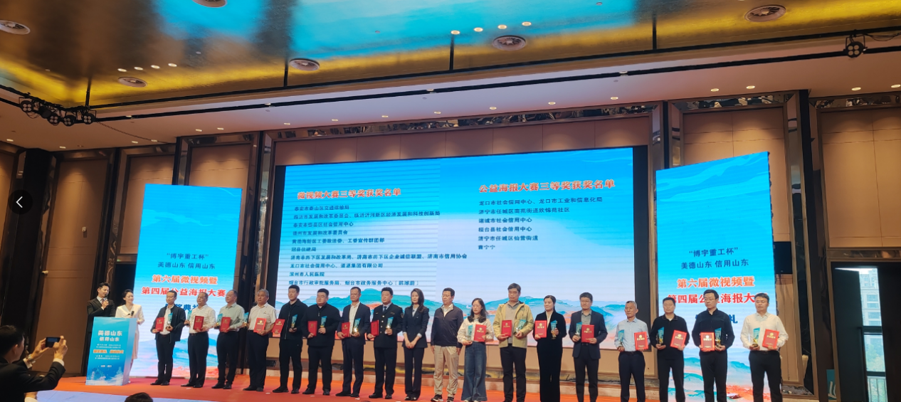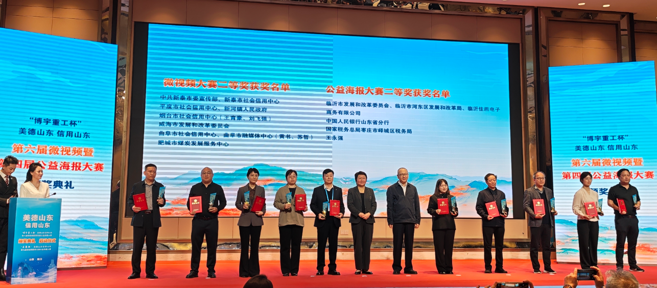 10月15日,美德山东信用山东微视频和公益海报大赛颁奖暨启动仪式在烟台龙口盛大举行,我市提报的多个作品分别荣获二等奖、三等奖、网络人气奖等荣誉,其中由临沂市发展和改革委员会、临沂市河东区发展和改革局、临沂佳画电子商务有限公司提报的《诚信为帆 行稳致远》获得公益海报大赛二等奖、临沂市发展和改革委员会、临沂沂河新区经济发展和科技创新局提报的《传“诚”》获得微视频大赛三等奖、沂水农商银行提报的《信用点亮美好生活》获得网络人气奖。