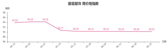 本周,服装服饰类周价格指数收于90.26点,环比下跌0.02点。从盘面看,男装、女装类指数分别下跌0.02、0.03点,是导致服装服饰类周价格指数下跌的主要因素。