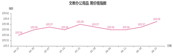 本周,文教办公用品类周价格指数收于105.59点,环比上涨0.02点。其中,体育娱乐用品、文化办公用品类指数分别上涨0.02点和0.01点,涨幅微小。