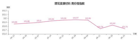 本周,建筑装潢材料类周价格指数收于101.74点,环比下跌0.09点,跌幅0.09%。从盘面看,二级分类中两跌两平,其中装饰材料类环比下跌0.09点,专用材料类环比下跌0.19点,拉动整体指数下行,结构材料类、结构安装材料类指数与上周持平。