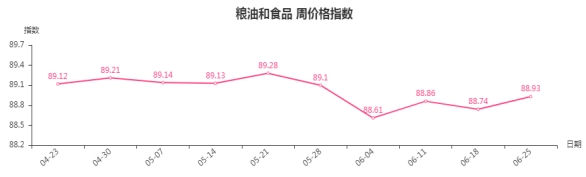 本周,粮油和食品类周价格指数收于88.93点,环比上涨0.19点。其二级子类中茶叶、粮油类指数分别上涨0.3和0.25点,干果、调味品类指数分别下跌0.04和0.01点。