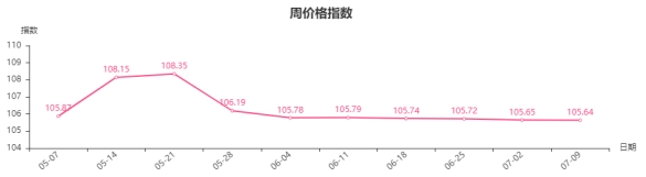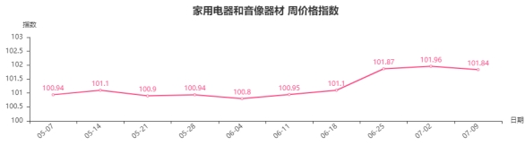 本周,家用电器和音像器材类周价格指数收于101.84点,环比下跌0.12点。其二级子类中厨房电器类、个人生活电器类、制冷电器类、热水器类分别下跌0.44、0.14、0.07、0.05点;净化电器类、电风扇类、家居电器类、音像器材类分别上涨0.19、0.08、0.06、0.02点。
