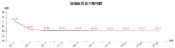 本周,服装服饰类周价格指数收于90.22点,环比下跌0.02点。从盘面看,男装、女装类指数分别下跌0.06、0.02点,是导致服装服饰类周价格指数下跌的主要因素。