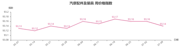 本周,汽摩配件及装具类周价格指数收于93.14点,环比下跌0.02点。其二级子类中汽车装饰类指数下跌0.06点,汽车配件类、摩托车配件类指数与上周持平。汽车装饰类中养护用品、小饰品、改装配件、玻璃膜分别下跌0.54、0.25、0.18、0.04点。