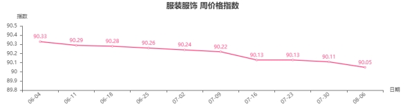 本周,服装服饰类周价格指数收于90.05点,环比下跌0.06点。从盘面看,男装、女装、男童装类指数分别下跌0.10、0.08、0.01点,是导致服装服饰类周价格指数下跌的主要因素。