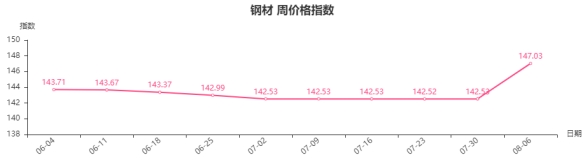 本周,钢材类周价格指数收于147.03点,环比上涨4.50点,涨幅3.16%。从盘面看,钢材三级分类全部出现上涨,其中建筑钢材类涨幅最大,环比上涨6.30点,拉涨整体指数;板材类、型材类、管材类指数同步上行,指数分别上涨4.75点、4.05点和1.65点。