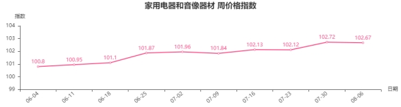 本周,家用电器和音像器材类周价格指数收于102.67点,环比下跌0.05点。其二级子类中制冷电器类、热水器类、个人生活电器类、净化电器类、音像器材类分别下跌0.7、0.06、0.05、0.04、0.03点,电风扇类、厨房电器类、家居电器类分别上涨0.17、0.05、0.01点。
