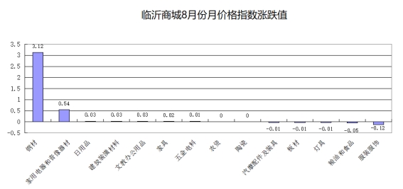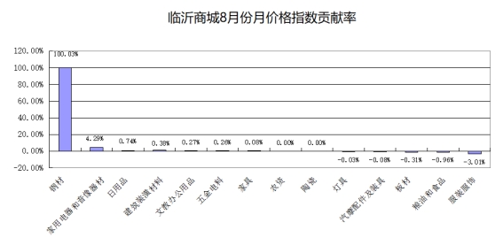 从对价格总指数贡献率看,本月临沂商城价格指数主要受钢材类拉动回升,贡献率达到100.03%;其次是家用电器和音像器材类,贡献率为4.29%(见下图)。