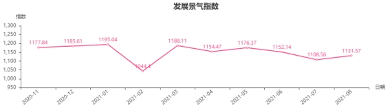 从发展景气指数构成来看,2021年8月份,发展规模指数收于1074.19点,环比上涨36.18点,涨幅3.49%,调查问卷显示,认为本月本类商品的进货量上升的商户环比上涨4.5%;发展效益指数收于1314.88点,环比上涨16.08点,涨幅1.24%,调查问卷显示,认为本月本类商品销售实现的经营毛利总额增加的商户环比上涨4%;发展信心指数收于1000.03点,环比上涨0.47点,涨幅0.05%,调查问卷显示,认为本月本类商品总体经营状况较好的商户环比上涨1.6%。
