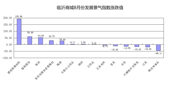现将8月份发展景气指数涨跌幅较大和代表性较强的建筑装潢材料、服装服饰、板材、粮油和食品等市场行情作简要分析。