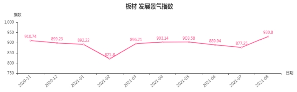 8月份,板材类发展景气指数收于930.8点,环比上涨53.55点,涨幅6.1%。
