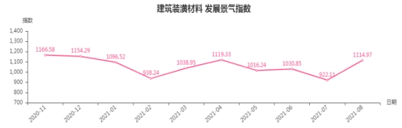 8月份,建筑装潢材料类发展景气指数收于1114.97点,环比上涨192.86点,涨幅20.92%,同比下跌179.45点,跌幅13.86%。