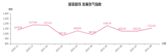 8月份,服装服饰类景气指数收于1113.41点,环比上涨59.88点,涨幅5.68%。