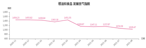 8月份,粮油和食品类发展景气指数收于1029.47点,环比下降45.11点,降幅4.20%;同比下降417.39点,降幅28.85%。