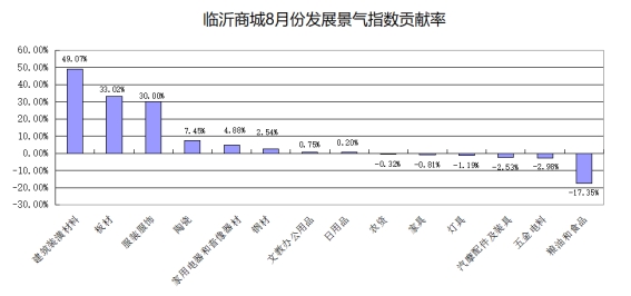 从对发展景气总指数贡献率看,建筑装潢材料类、板材类、服装服饰类等三大类商品对总发展景气指数上涨拉动较大,贡献率分别为49.07%、33.02%、30.00%(见下图)。