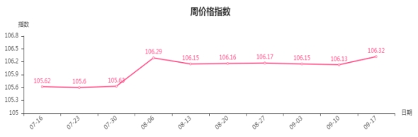 据临沂商城价格指数信息系统监测,本周(9月10日-9月17日)临沂商城周价格总指数为106.32点,环比上涨0.19点。