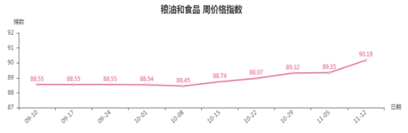 本周,粮油和食品类周价格指数收于90.18点,环比上涨0.83点。从盘面看,粮油、茶叶、干果类指数分别上涨1.05、0.2和0.09点,调味品类指数下跌0.01点。