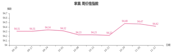 本周,家具类周价格指数收于94.42点,环比下跌0.05点。其中柜类、坐具类、桌类指数分别下跌0.1、0.06、0.01点,是导致家具周价格指数下跌的主要因素。