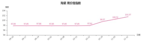 本周,陶瓷类周价格指数收于101.57点,环比上涨1.04点,涨幅1.03%。从盘面看,二级分类中建筑陶瓷、日用陶瓷、陶瓷洁具周价格指数均小幅上涨,分别上涨1.38、0.79、0.34点,涨幅分别为1.38%、0.76%、0.34%。