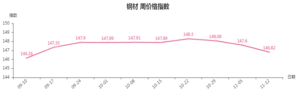 本周,钢材类周价格指数收于146.82点,环比下跌0.78点,跌幅0.53%。从盘面看,钢材三级分类全部出现下跌,其中板材类跌幅最大,指数环比下跌1.08点,成拉动指数下行主力,建筑钢材类、型材类、管材类指数同步下跌,分别下跌0.64点、0.67点和0.68点。