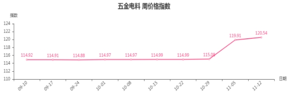 本周,五金电料类周价格指数收于120.54点,环比上涨0.63点。其二级子类中五金工具类、五金零部件类、电工电器类、仪器仪表类环比分别上涨0.88、0.8、0.05、0.05点,焊机焊具和焊材类微降0.01点。