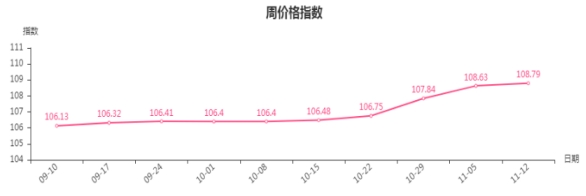 近期,随着原材料、运输等成本不断上涨,陶瓷产品生产成本提高,经销商上调了部分商品出厂价格;另外,随着天气转冷,日用陶瓷产品市场需求增加,陶瓷盘、陶瓷碟等陶瓷餐具产品销量上涨,且零散户客流量增加,从而拉动日用陶瓷类产品平均销售价格小幅上涨;致使本周陶瓷类周价格指数上行。从具体规格品看,地中海风300*300仿古瓷砖本周价格为8元/片,价格上涨14.30%;MGW1-30B56B 30*30内墙瓷砖本周价格为6.83元/片,价格上涨13.80%;陶瓷纤维盘根/3*3陶瓷盘本周价格为6.81元/个,价格上涨8.10%;初夏5寸陶瓷碗本周价格为12.02元/个,价格上涨7.80%。