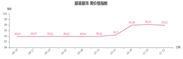 本周,服装服饰类周价格指数收于95.92点,环比下跌0.39点。从盘面看,男装、女装、帽类指数分别下跌0.16、0.06、0.02点,是导致服装服饰类周价格指数下跌的主要因素。