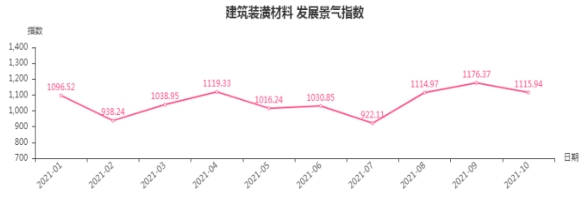 10月份,建筑装潢材料类发展景气指数收于1115.94点,环比下跌60.43点,跌幅5.14%;同比下跌1.65点,跌幅0.15%。