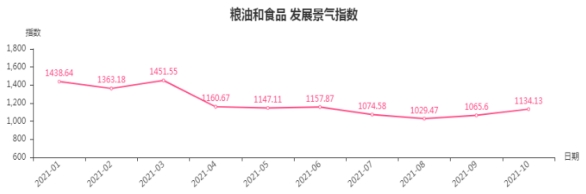10月份,粮油和食品类发展景气指数收于1134.13点,环比上涨68.53点,涨幅6.43%。