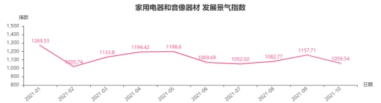 10月份,家用电器和音像器材类发展景气指数收于1059.54点,环比下跌98.17点,跌幅8.48%(见下图)。
