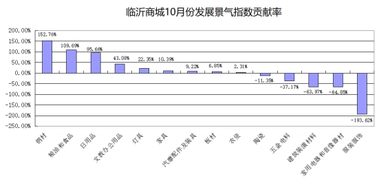 从对发展景气总指数贡献率看,钢材类、粮油和食品类、日用品类等三大类商品对总发展景气指数上涨拉动较大,贡献率分别为152.76%、109.69%、95.66%(见下图)。