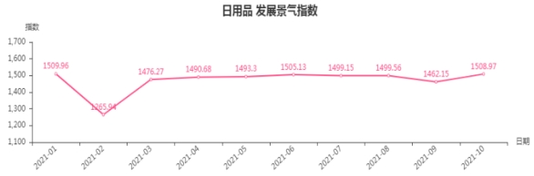 10月份,日用品类发展景气指数收于1508.97点,环比上涨46.82点,涨幅3.2%。