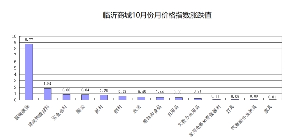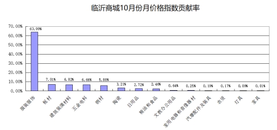 从对价格总指数贡献率看,本月临沂商城价格指数主要受服装服饰类拉动上涨,贡献率达到63.99%;其次是板材类、建筑装潢材料类、五金电料类,贡献率分别为7.01%、6.82%、6.66%(见下图)。