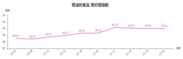 本周,粮油和食品类周价格指数收于90.01点,环比下跌0.04点。从盘面看,茶叶、粮油、干果类指数分别下跌0.12、0.06和0.04点;调味品类价格上涨0.02点。