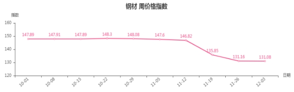 本周,钢材类周价格指数收于131.08点,环比下跌0.08点,跌幅0.06%。从盘面看,钢材三级分类中互有涨跌,其中建板材类、管材类小幅下跌,指数分别下跌0.14点和0.79点,建筑钢材类、型材类指数分别上涨0.15点和0.02点。