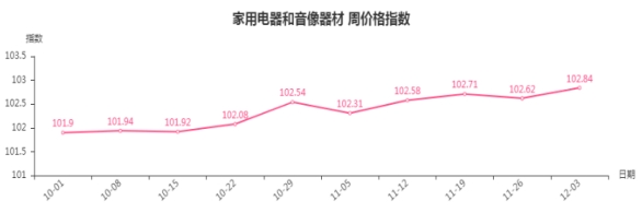 本周,家用电器和音像器材类周价格指数收于102.84点,环比上涨0.22点。其二级子类中制冷电器类、个人生活电器类、净化电器类、厨房电器类、音像器材类分别上涨0.94、0.52、0.26、0.19、0.06点。