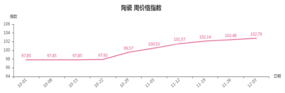 本周,陶瓷类周价格指数收于102.79点,环比上涨0.31点,涨幅0.3%。从盘面看,二级分类中陶瓷洁具、日用陶瓷类周价格指数小幅上涨,分别上涨1.08、0.43点;建筑陶瓷类指数基本保持稳定。