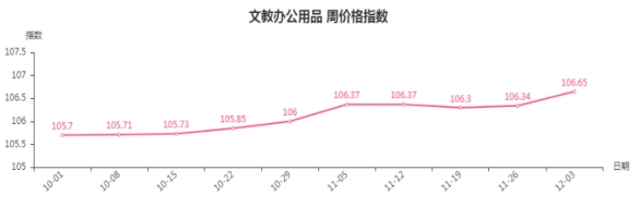 本周,文教办公用品类周价格指数收于106.65点,环比上涨0.31点。二级分类中文化办公用品、体育娱乐用品类指数分别上涨0.51点和0.01点。