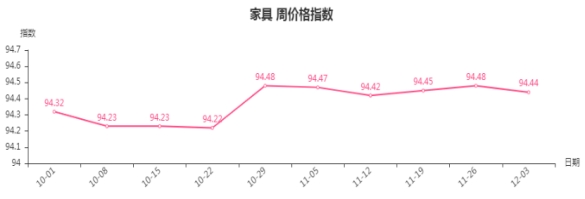 本周,家具类周价格指数收于94.44点,环比下跌0.04点。其中架类、床及用品类、桌类指数分别下跌0.2、0.04、0.02点,其它类指数趋稳。