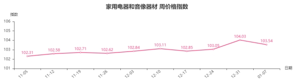 本周,家用电器和音像器材类周价格指数收于103.54点,环比下跌0.49点。从盘面看,二级分类中厨房电器、取暖电器、音像器材、制冷电器、个人生活电器指数小幅下跌,分别下跌1.41、0.52、0.31、0.19、0.04点。净化电器小幅回升,环比上涨0.20点。
